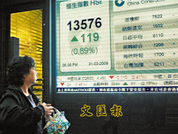 中新網(wǎng)4月1日電 據(jù)香港《文匯報》報道,3月31日是港股今年首季最后一個交易日,大市收升119點報13576點,但首季計跌達5.6%,或811.46點,跌幅在亞太區(qū)排第3。大市市值蒸發(fā)約2740億元,余下約10萬億元。分析員指出,大市3月份走勢有好轉(zhuǎn)跡象,但在1.4萬點見阻力,料第二季仍為波動市,將在1.3萬-1.4萬點上下。