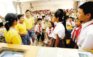 深圳與香港的小學(xué)生分別走向講臺(tái),用自己制作的多媒體向?qū)Ψ浇榻B各自的城市,這是9月27日在濱河小學(xué)看到的一幕。兩地師生通過(guò)交流活動(dòng)在國(guó)慶節(jié)來(lái)臨前夕體驗(yàn)民族情感,陶冶愛國(guó)情操。李偉文攝(圖片來(lái)源:深圳特區(qū)報(bào))