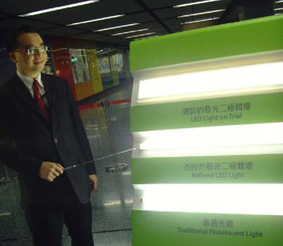港鐵去年初耗資四百萬港元,在港島、荃灣及將軍澳三趟市區(qū)地鐵列車進行車廂LED環(huán)保燈測試計劃,港鐵總結(jié)稱,測試收到良好效果,除能有效節(jié)省能源外,LED燈的壽命較傳統(tǒng)光管耐用高四倍,達五萬小時,且更換時只需換走芯片便可,不會釋放水銀和制造光管垃圾。同時LED光線更接近自然日光,并不會釋放紫外光,可保護乘客眼睛,在測試期間廣為乘客歡迎。