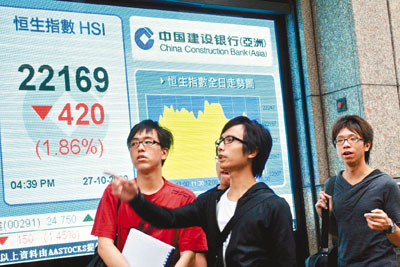 中新網(wǎng)10月28日電 據(jù)香港《文匯報》報道,外圍股市跌,拖累港股在臨近期指結算前急挫,恒指27日隨美股疲軟而低開573點,其后跌幅一度收窄至不足400點,但午后內(nèi)地股市“插水”,大跌近3%,恒指下午再一輪下跌,結果全日跌420點,收報22169.5點,跌1.86%,是三周以來最大跌幅,港股成交額739億元。