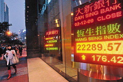 中新網(wǎng)12月3日電 據(jù)香港《文匯報》報道,外圍股市繼續(xù)造好,迪拜世界的陰霾看似消散,加上市場憧憬迪拜世界事件將拖慢各國政府的退市時間表,港股連升第3天,最多曾升326點,午后由于投資者觀望美國3日公布的最新經(jīng)濟數(shù)據(jù),港股升幅收窄,恒指全日收報22289.5點,升176.4點,成交額783億元,3天已累升逾1100點。