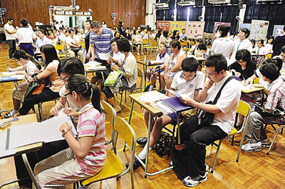 中新網(wǎng)7月8日電 據(jù)香港《文匯報》報道,香港今年6.8萬名小六生中,成功獲派首三志愿學(xué)生只有85%,較去年下跌3%,余下過萬名小六生希望落空。升中派位7日發(fā)榜后,即掀起一陣瘋狂叩門潮,不少失意學(xué)生及家長紛紛把握最后機會四出往心儀學(xué)!皳洹睂W(xué)位,多間英中、名牌中中及直資中學(xué)也逼滿心急如焚的人潮。