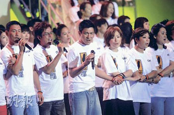 這次賑災(zāi)晚會(huì)的司儀多達(dá)13人,包括陳百祥、鮑起靜、吳君如、吳小莉、張艾嘉、庾澄慶、區(qū)永權(quán)、周國(guó)豐等兩岸三地代表及各大電視臺(tái)、電臺(tái)的代表。逾300名來(lái)自兩岸三地的歌手藝人包括曾志偉、譚詠麟、劉德華、張學(xué)友、郭富城、鄭秀文、楊千嬅、李克勤、謝安琪、古巨基、周慧敏、鄭少秋、陶喆、蔡琴、蕭敬騰等不遺余力地呼吁大家踴躍捐款。