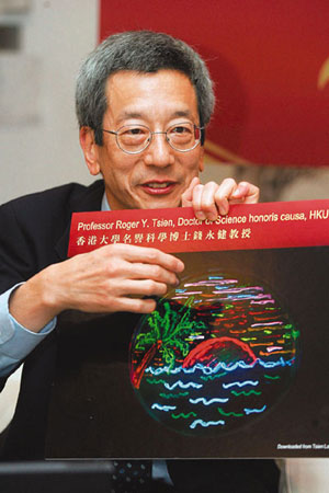 繼香港大學(xué)8日向錢永健頒授榮譽(yù)博士榮銜外,香港中文大學(xué)10日也會(huì)向他頒發(fā)榮譽(yù)理學(xué)博士,并由特首曾蔭權(quán)親自頒授。錢永健在香港的行程緊湊。他9日首先出席公開講座,以“點(diǎn)綠成金”為題,在香港大學(xué)發(fā)表演說,當(dāng)中展示了他的實(shí)驗(yàn)室的最新研究進(jìn)展。