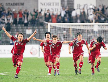 10日是仗香港男足于44分鐘由后衛(wèi)陳偉豪接應(yīng)角球頂成1﹕0,傾力反撲的朝鮮一度讓香港男足陣腳大亂,結(jié)果在完場(chǎng)前5分鐘由樸光龍追成1﹕1,兩軍在加時(shí)賽沒(méi)有改寫紀(jì)錄,須以互射12碼定勝負(fù)。