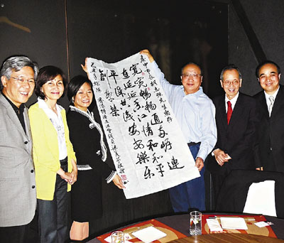 會(huì)上,梁美芬送了一幅字畫(huà)給胡志強(qiáng)作見(jiàn)面禮,上面寫(xiě)有她創(chuàng)作的一首賦:“寬寬暢暢通海峽、連連延延香江情、和和平平謀共識(shí)、安安樂(lè)樂(lè)創(chuàng)繁榮”。胡志強(qiáng)也禮尚往來(lái),充分發(fā)揮其幽默本色,說(shuō)“從政就是要所有人快樂(lè)”。