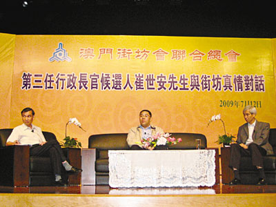 中新網(wǎng)7月13日電 據(jù)香港《文匯報》報道,澳門行政長官唯一候選人崔世安發(fā)表參選政綱后,隨即到各大社團介紹政綱。12日他到澳門街坊會聯(lián)合總會,向逾400位街坊推介政綱兼真情對話。