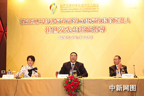 中新網(wǎng)7月16日電 第三任澳門特區(qū)行政長官候選人崔世安昨日與博彩管理暨中介人總會座談。