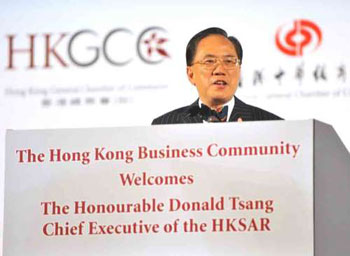 曾蔭權(quán)2日出席商界聯(lián)席午餐會,闡述施政報告內(nèi)容,讓商界更了解特區(qū)政府未來一年的施政方針。曾蔭權(quán)表示,香港是一個不斷追求進步的城市,今年的施政報告是為了進一步推動香港在經(jīng)濟、社會和政治方面的進步,每一個人都必須參與其中,發(fā)揮自己的一分力量。