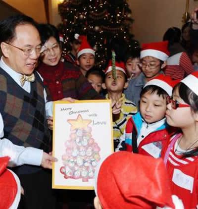 曾蔭權(quán)伉儷24日在禮賓府舉行了一個圣誕派對,邀請40多位來自深水埗的小學(xué)生,擔(dān)任他的特別嘉賓,一同歡度一個溫馨愉快的早上。曾蔭權(quán)在博客中透露,自己與小朋友在圣誕樹前大合照,他們又送其一張巨型的圣誕卡,里面全是他們可愛的簽名和祝福,其中一句“祝你長命一點(diǎn)”更是“搶眼”:“小孩的直率和可愛,令我不禁失笑。”