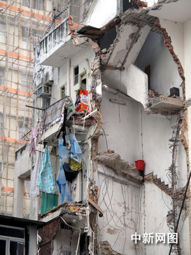 在微風(fēng)中,懸在剝露于外的墻壁上的美女海報、來不及收的晾曬衣物和家當,沿著樓梯痕跡排列的七倒八歪的信箱、放在已成為“懸崖”的墻角處的紅色膠桶、鐵架床床頭的毛絨玩具……訴說著一個個已不復(fù)存在的故事。震撼猶存,更令人唏噓。