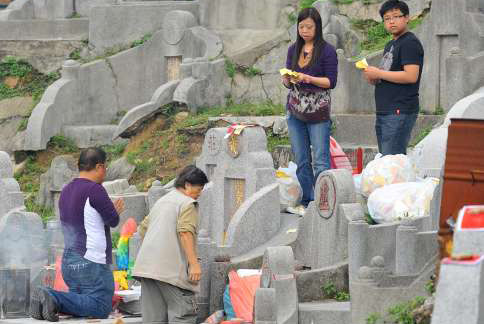 在鉆石山墳場(chǎng),依舊有大批市民扶老攜幼,手挽大包小包香燭、冥鏹、元寶;以及鮮花、燒豬、燒肉、生果等祭品,昨日早上前往掃墓,但較去年人數(shù)略為減少。市民陳小姐說(shuō),今年掃墓較去年少人,“可能是清明撞正復(fù)活節(jié)長(zhǎng)假,不少市民提早掃墓,或外出旅游未返有關(guān),今年行上山都沒(méi)過(guò)去擠迫!