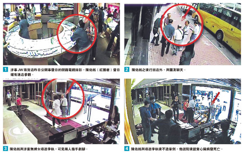 陳佑銘的遺孀、女兒及家屬經(jīng)過極力要求,昨日獲安排到肇事珠寶店翻看事發(fā)時的閉路電視。據(jù)悉,家屬逗留該店半小時,當看到職員及導(dǎo)游對陳佑銘的態(tài)度時,家屬一度情緒激動,要由他人扶持下離開。