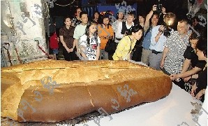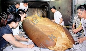 澳門(mén)豬扒包遠(yuǎn)近馳名,這次壯舉,由澳門(mén)女企業(yè)家與金馬輪咖啡餅店合作,并由金馬輪店焗制。巨型豬扒包長(zhǎng)293公分、寬155公分、高33公分,共重540磅,動(dòng)用面粉200斤、豬扒80磅。從搓面粉、發(fā)酵等工序到最終“面世”,共耗時(shí)逾13小時(shí),需7個(gè)員工合力制作。