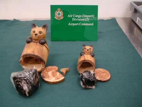 案情透露,海關(guān)機(jī)場(chǎng)科人員于9月27日清晨檢驗(yàn)五件由清邁經(jīng)香港轉(zhuǎn)運(yùn)到加州,報(bào)稱(chēng)“木制工藝品”的紙箱包裹。關(guān)員利用X光檢查后,發(fā)現(xiàn)箱內(nèi)物品可疑,并開(kāi)箱割開(kāi)多件“木制貓”雕刻品檢驗(yàn),發(fā)現(xiàn)內(nèi)里藏有用膠袋包裝的熟鴉片,共重約29公斤。