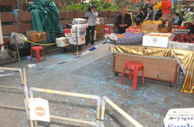 中新網(wǎng)3月15日電 據(jù)香港《大公報》報道,香港柴灣道一間水果攤因拒交“陀地”費5年來頻被黑幫滋擾,患癌店東受刺激致病情惡化去世,遺孀和兩子接手后滋擾仍未間斷,14日晨店鋪開業(yè)時,被兩名惡漢突然走近潑淋藍色油漆,少東走避不及輕微濺中,另一名街坊婆婆經(jīng)過也中招,幸有驚無險。