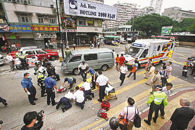 另外,一對來港探親、上了年紀的內地姐弟,昨天上午11時45分在旺角染布房街近亞皆老街交通燈路口橫過南行線馬路時,1輛沿亞皆老街東行客貨車右轉入染布房街,弟及時閃避, 68歲陸姓老婦卻被客貨車撞個正著,當場飛彈數(shù)呎倒地,頭破血流昏迷,送院情況危殆。肇事客貨車黃姓30歲司機事后在場助查,警方正調查是否有人不遵照交通燈號導致意外。