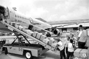 五月十八日,澳門救助四川地震災民的首批救災物資在澳門國際機場裝倉啟運。由澳門紅十字會及澳門街坊總會認購的這批救災物資包括奶粉、毛毯、食品、電筒等災區(qū)急需的物資共十二噸。這些物資由澳門航空公司免費運送,將于當日下午抵達成都雙流國際機場。 中新社發(fā) 史利 攝