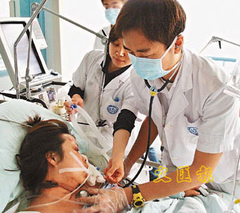 尹淑玲抵達醫(yī)院后,便協(xié)助病房內(nèi)約百位骨折的病人,她把消毒藥水、紗布等放滿紅色背囊,懶理背囊與護士服不相襯,便扛著它穿梭病房,為病人清洗傷口,每天只睡4、5小時!坝袀做了腳部截肢手術(shù)的30來歲的男病人,他背部也有一個大傷口,每次為他清洗傷口時,明知他很痛,但他很堅強,更感謝我們的幫忙!