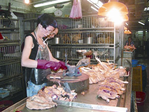 圖:澳門街市雞販戴手套操作,注重清潔衛(wèi)生。(圖片來源:澳門日報(bào))