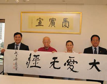 在這個(gè)“愛(ài)心書(shū)畫(huà)義賣(mài)區(qū)”內(nèi),最矚目的是國(guó)學(xué)大師饒宗頤教授親筆所寫(xiě)的“大愛(ài)無(wú)疆”,這四個(gè)大字已被香港潮屬總會(huì)名譽(yù)會(huì)長(zhǎng)高佩璇居士以500萬(wàn)港元義購(gòu),可謂一字百萬(wàn)金。在這里,最珍貴的不是這些字,也不是這筆捐款,而在于它帶來(lái)的情感上的震撼,一種骨肉相連、發(fā)自肺腑的真情。