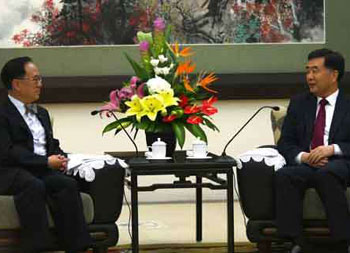 在粵港合作第十一次聯(lián)席會議舉行前夕,汪洋在廣州珠島賓館會見了參加粵港聯(lián)席會議的特首曾蔭權(quán)及政務(wù)司司長唐英年、政制事務(wù)局局長林瑞麟等香港特區(qū)政府官員一行。