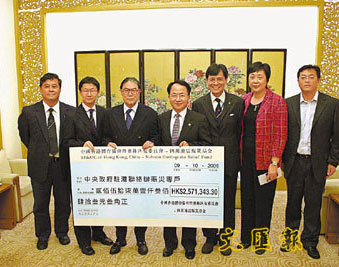 日前港協(xié)暨奧委會會長霍震霆、副會長余國梁、義務秘書長彭沖及義務副秘書長王敏超,攜同捐款支票到中聯(lián)辦,由中聯(lián)辦副秘書長王志民、宣傳文體部副部長陳亞瓊及李冰接受,將全數(shù)捐款轉交“中央政府駐港聯(lián)絡辦賑災專戶”,幫助四川災區(qū)人民。