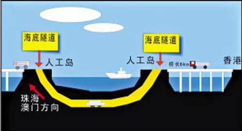 據(jù)大橋工程可行性研究總報(bào)告顯示,大橋主體工程長(zhǎng)約35公里,擬定采用橋隧結(jié)合方案,其中位于伶仃西航道和銅鼓航道之間的海底隧道長(zhǎng)6.75公里,隧道與橋梁相接處各修兩個(gè)橫截面長(zhǎng)1公里的人工島;隧道造價(jià)約211億元人民幣,占到大橋主體工程預(yù)算投資額的近一半,其最深處離海平面40米左右,將確保30萬(wàn)噸級(jí)油輪和15萬(wàn)噸級(jí)以上集裝箱順利通航。