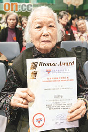 中新網(wǎng)11月19日電 九旬長者仍然老有所為。據(jù)香港媒體報道,九十六歲的張麗華雖然居于香港安老院,親人長居英國,但她精神甚佳,七年前自發(fā)為院舍出一分力,專責(zé)探訪院友登記一職,至今仍快樂地盡其所職,昨日(十八日)獲頒發(fā)義工獎勵計劃銅章,以表揚及肯定張婆婆對小區(qū)的付出。