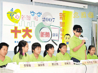 負(fù)責(zé)舉辦選舉的香港小童群益會(huì)第4屆“香港小特首”,上月分別通過(guò)表格及網(wǎng)上投票進(jìn)行“童心新聞眼2007十大新聞選舉”,吸引28996名小四到中三學(xué)生參與投票,從30則候選新聞中選出心中的十大新聞,榮獲首3名的新聞依次為“熊貓‘盈盈’、‘樂(lè)樂(lè)’抵港 慶;貧w10周年”、“哈利波特大結(jié)局 風(fēng)靡全球”及“嫦娥一號(hào)發(fā)射成功 探月夢(mèng)想逐步成真”,分別取得18172票、16474票及15054票。