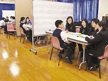 中新網1月14日電 升中學面試對香港小學生而言,有著舉足輕重的影響,故有小學日前舉行大型模擬面試,約50名高小學生家長搖身變成威嚴十足的面試官,以流利的兩文三語考核學生,協(xié)助近170名小六生預演氣氛緊張的升中面試。有學生早在1周前已認真準備,把握練習機會,全力爭取入讀心儀英文中學的機會。