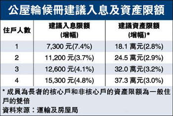 加上參考非住屋開支增幅后,房署建議提高輪候冊入息及資產(chǎn)限額,平均增幅5.5%及3.1%。單身人士入息限額由現(xiàn)在月入6800元,建議調(diào)升為7300元,增幅達7.4%,資產(chǎn)限額建議由現(xiàn)在17.6萬元,調(diào)升為18.1萬元。4人家庭入息限額就建議增為15300元,增幅4.8%,資產(chǎn)限額建議加至37.3萬元。