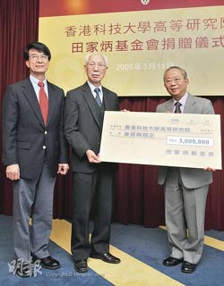 據(jù)香港媒體報道,田家炳基金會捐款300萬元給科大高研院,加上政府的配對基金,成立600萬元的“田家炳教育基金”;饡飨锛冶、科大校董會主席陳祖澤及校長朱經(jīng)武11日出席了捐贈鳴謝儀式。