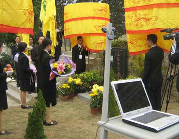各種網絡祭祀、電視公祭等時尚現(xiàn)代的祭祀方式,正被越來越多的人重視和接受。“祭祀現(xiàn)場、網絡直播”開播儀式日前在四會市聚福寶華僑陵園舉行。在現(xiàn)場,一邊由禮儀專員在墓碑前拜祭,另一邊則有兩臺計算機對整個拜祭過程進行同步直播。