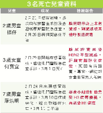 衛(wèi)生署早前在其中兩名死亡兒童身上發(fā)現(xiàn)的H1N1和H3N2病毒,基因分析顯示,病毒與區(qū)內(nèi)流行的型號一致,沒有變得特別惡、特別毒。