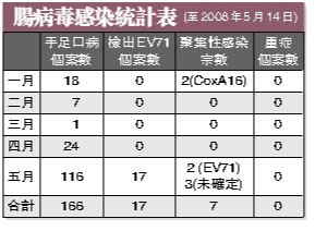 新證實的4宗EV71陽性個案包括:1例為同善堂第二托兒所幼兒;1例為濠江小學(xué)二年級學(xué)童,其弟為已停托的同善堂第二托兒所的幼兒,較早前亦有皰疹性咽峽炎癥狀;1例為仁伯爵綜合醫(yī)院因其它疾病住院的幼兒,在常規(guī)檢查中發(fā)現(xiàn),并無腸病毒感染的癥狀,14日已出院;1例為未入學(xué)或入托的門診病人。