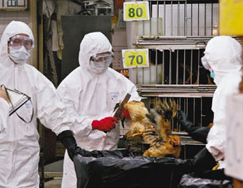 六月十一日,香港食環(huán)署人員穿著保護袍服到街市圍封活家禽零售點。漁護署當天宣布由于在深水埗等四個街市的雞只樣本,化驗出H5N1病毒呈陽性反應(yīng),因此決定于全港街市屠殺活家禽。漁護署表示,病毒源頭不排除是走私雞。 中新社發(fā) 譚達明 攝