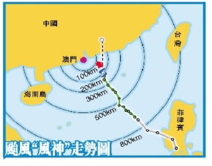 圖:臺(tái)風(fēng)“風(fēng)神”走勢(shì)圖。(圖片來(lái)源:澳門(mén)日?qǐng)?bào))