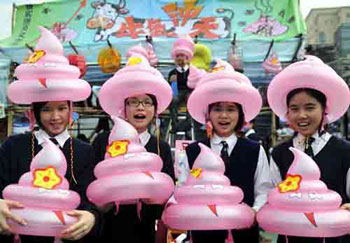 張祝珊英文中學(xué)第三度出戰(zhàn)維園年宵,兩班中四商科同學(xué)約60人,投資約7萬(wàn)元售賣1500頂“牛屎帽”。同學(xué)們穿上校服、戴上自己的創(chuàng)意產(chǎn)品叫賣,數(shù)字同學(xué)還齊聲發(fā)出祝福呼聲:“牛氣沖天”,并說(shuō)“牛屎等如牛市”,在股市疲弱下,這番話令股民特別醒神。