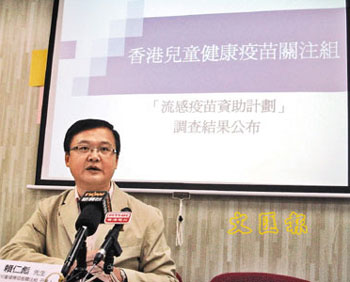 賴仁彪說:“根據(jù)以往針對高危人士及低收入人士的流行性感冒防疫注計劃,在特區(qū)政府免費(fèi)的資助及號召下,接種針數(shù)達(dá)27萬針,與現(xiàn)時8萬針相差很大!弊罱K若由特區(qū)政府免費(fèi)為兒童打針,他相信接種率可提升至90%。
