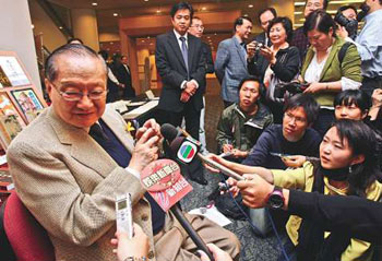 二月十六日,為緬懷上月底病逝的武俠小說(shuō)宗師梁羽生,《大公報(bào)》和天地圖書在香港中央圖書館舉辦座談會(huì)。著名武俠小說(shuō)作家金庸就梁羽生在當(dāng)代文學(xué)、詩(shī)詞、楹聯(lián)等方面的造詣和成就以及生平逸事趣聞,與其著作愛(ài)好者和公眾座談分享。 中新社發(fā) 張勤 攝