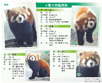 成都大熊貓繁育研究基地向海洋公園借出的4只小熊貓,名字分別叫泰山、聰聰、柔柔和栗子,兩雄兩雌,現(xiàn)時(shí)仍未滿1歲,平均只有8至9個(gè)月大,屬基地繁殖的第二代小熊貓,各有不同性格及特征。