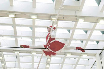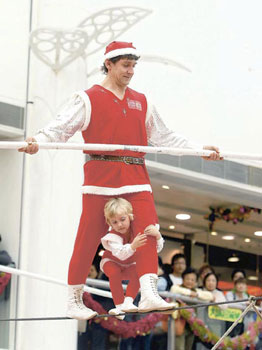 據(jù)香港明報(bào)報(bào)道,一行8人的衛(wèi)氏家族成員,昨(6日)于香港大埔商場作高空表演。在半小時(shí)表演內(nèi),衛(wèi)氏家族成員粉墨登場,一家大小扮成圣誕老人。帶領(lǐng)家族成員的Peter Mario,先以一個(gè)“筋斗”給觀眾一個(gè)見面禮,再來一招“倒豎”,這些動(dòng)作看似簡單,但卻是在高空13米、離地近兩層樓高的鋼在線進(jìn)行。
