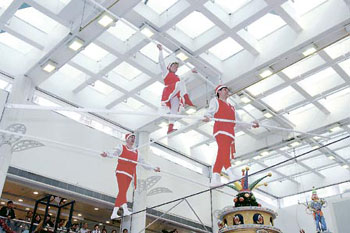 25歲的Jasmine是Peter的女兒,昨天她表演在鋼在線推手推車,走過10多米的距離。樣貌標(biāo)致的Jasmine,一面手執(zhí)平衡桿,面帶笑容走過腳下的幼絲,臺下的觀眾卻為她“一步一驚心”。Jasmine說,她曾試過離開表演事業(yè),在外另覓工作,但始終心系腳下這條鋼線!笆冀K一家人 能一起工作,獲得安全感和快樂,是外面找不到的,而且我熱愛演出。”(周淑蘭)