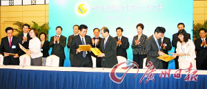 粵港合作聯(lián)席會議第十一次會議結束后,根據(jù)會議達成的共識,粵港雙方有關專責小組就切實落實開放香港服務業(yè)在廣東先行先試政策措施,簽署了11個合作協(xié)議。省長黃華華、香港特別行政區(qū)行政長官曾蔭權、國務院港澳辦副主任周波、中央政府駐香港聯(lián)絡辦副主任郭莉、副省長萬慶良見證了簽署儀式。