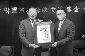 考察團團長李偉杰向江丙坤致送紀念品。(圖片來源:澳門日報)