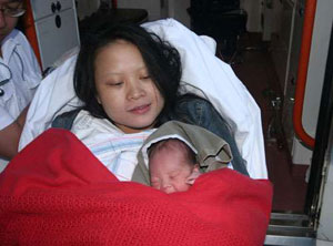 昨日中午十二時(shí)零二分,邱婦由丈夫陪同下乘坐粵港直通火車由廣州來(lái)港,坐于第三卡普通等車廂。當(dāng)火車越過(guò)深港邊境駛抵羅湖火車站時(shí),突然感到腹部痛楚,腹中胎兒急不及待要出世,其夫慌忙找列車人員求助。九廣東鐵得知情況后,將火車停泊羅湖火車站側(cè)線,透過(guò)廣播向乘客宣布阻延原因。乘客中有一名美籍華裔女醫(yī)生和數(shù)名護(hù)士,聽(tīng)到消息趕往該車廂提供協(xié)助,眾人分工合作,協(xié)助邱婦順利誕下麟兒,夫婦皆歡喜若狂,救護(hù)人員稍后亦趕至。