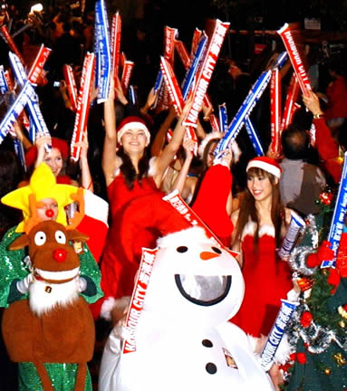 晚上踏入倒數(shù)時分,香港市民聚集在海港城對面的廣東道參加迎圣誕倒數(shù):“5、4、3、2、1……圣誕快樂!”在凌晨零時圣誕到臨一刻,在場市民齊聲喊出“圣誕快樂!”聲震云霄,大會發(fā)放燦爛的煙火和灑下密密麻麻的白紙碎,霎時間,香港尖沙咀好像下了冬雪,將派對氣氛推向高潮。