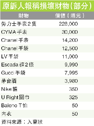 唐仔細(xì)羅列37項受損財物,其中以衣物為主,包括價值50元的內(nèi)衣及成衣品牌Baleno出品的T恤;另外的名貴財物包括接近4000元的茅臺酒、勞力士、Chanel及CYMA等4只名表,所有財品總值36.6萬元。此外,唐的一塊載有婚宴來賓簽字的紅布,以及數(shù)項衣物亦損壞,但價值有待確定。