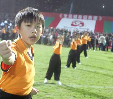 “中華武術(shù)健身操”由全民健身之星謝霆鋒聯(lián)同6位北京奧運(yùn)武術(shù)香港代表包括黑志宏、鄭仲恒、羅琛賢、梁家瑋、耿曉靈和劉洋演出。6000名市民在司儀的呼喊下幾乎同時(shí)站起,與偶像和奧運(yùn)武術(shù)代表一同起舞,熟悉的,陌生的,相視而笑,毫不顧忌姿勢(shì)是否優(yōu)美。